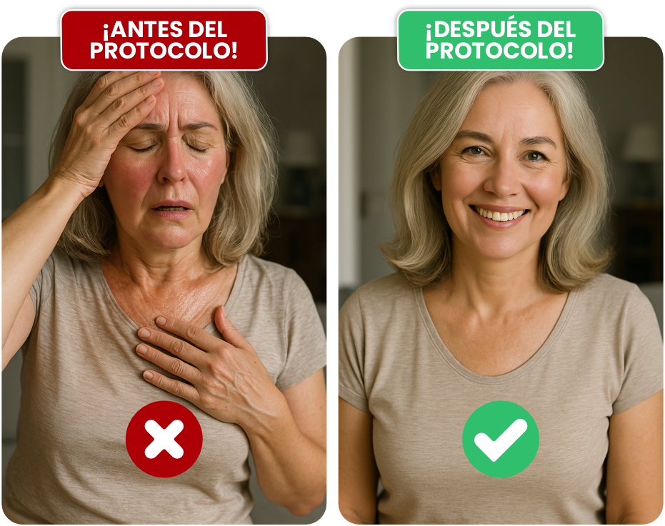 Seguirás un protocolo casero y natural que actúa como un auténtico remedio hormonal para reducir los sofocos, la hinchazón y la irritación. ¡La mayoría de las mujeres experimentan alivio en las primeras 72 horas!